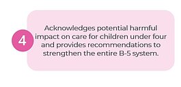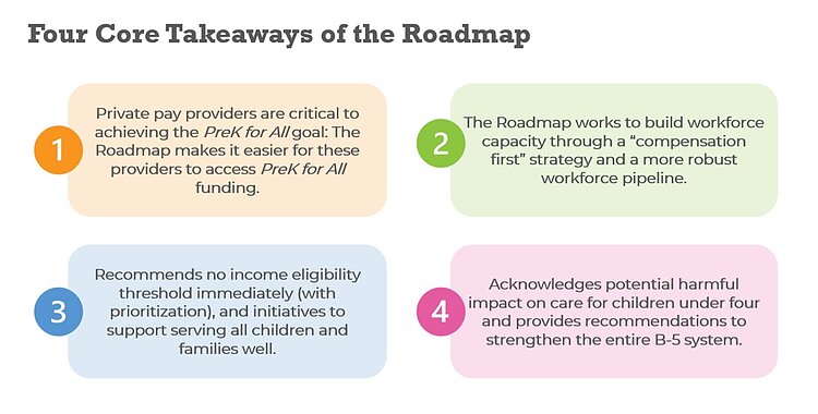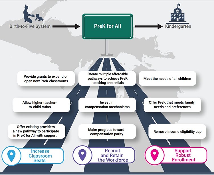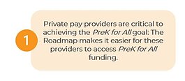 لتحقيق هذا الهدف، توصي خارطة الطريق بضمان إمكانية الوصول إلى التمويل من قبل مزيد من مقدمي الخدمات المجتمعية وإنشاء برنامج تجريبي لمقدمي التعليم المبكر المنزلي الذي سيسمح لمقدمي الخدمات المنزلية الحاليين بمسار جديد للمشاركة في برنامج “التعليم ما قبل الابتدائي للجميع”.