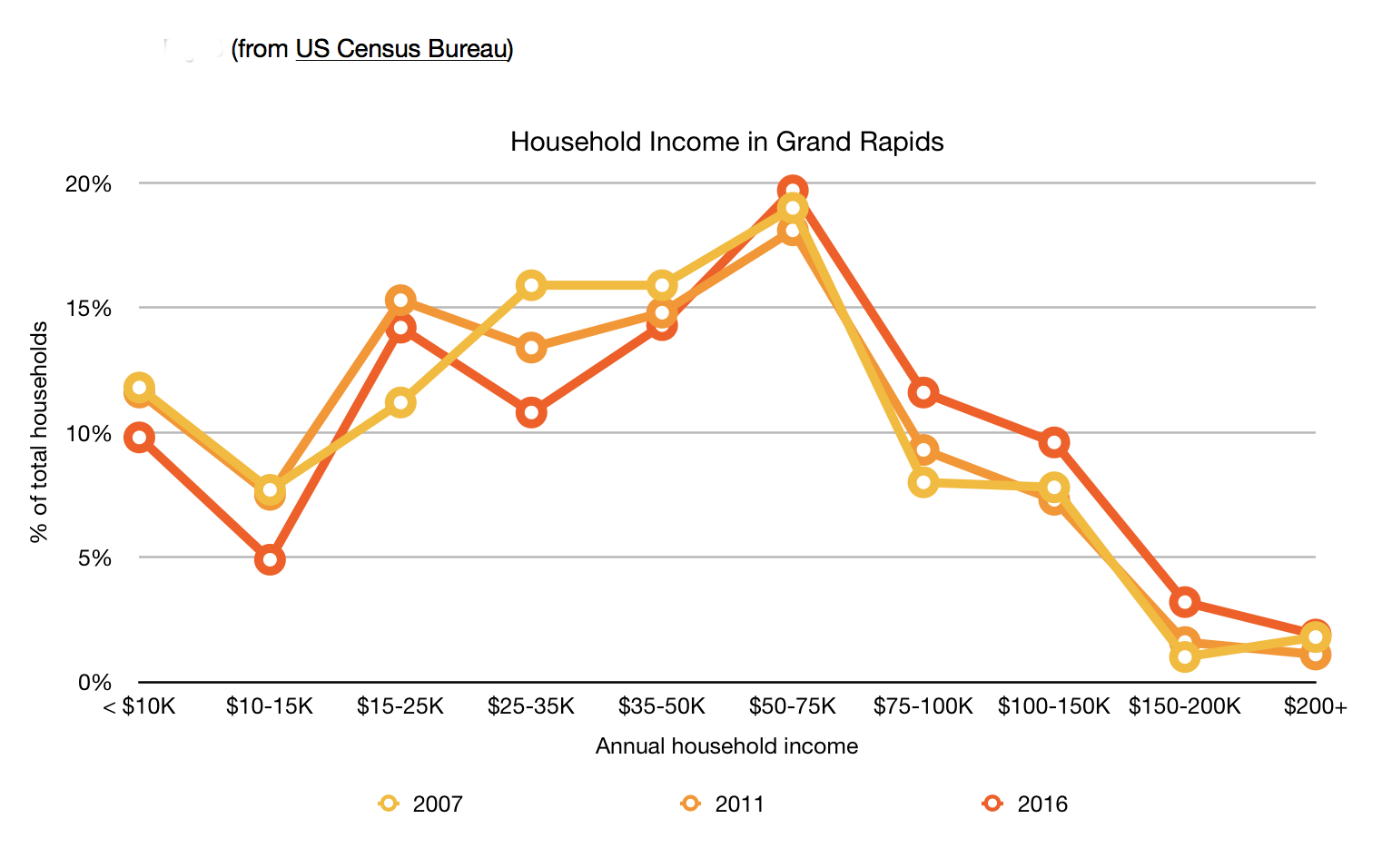 The median income of Grand Rapids residents rose almost 20 percent between 2007 and 2016, but that doesn’t mean residents’ earning power has increased equally across socioeconomic brackets.
