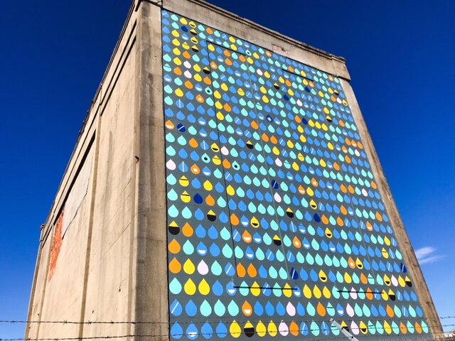 Wooden stencils were install in 7-by-9-foot grids with 600 water droplets covering the three-story structure. A key explains the mural’s coding system and outlines Woods’ process, as well as the importance of responsible waste management.