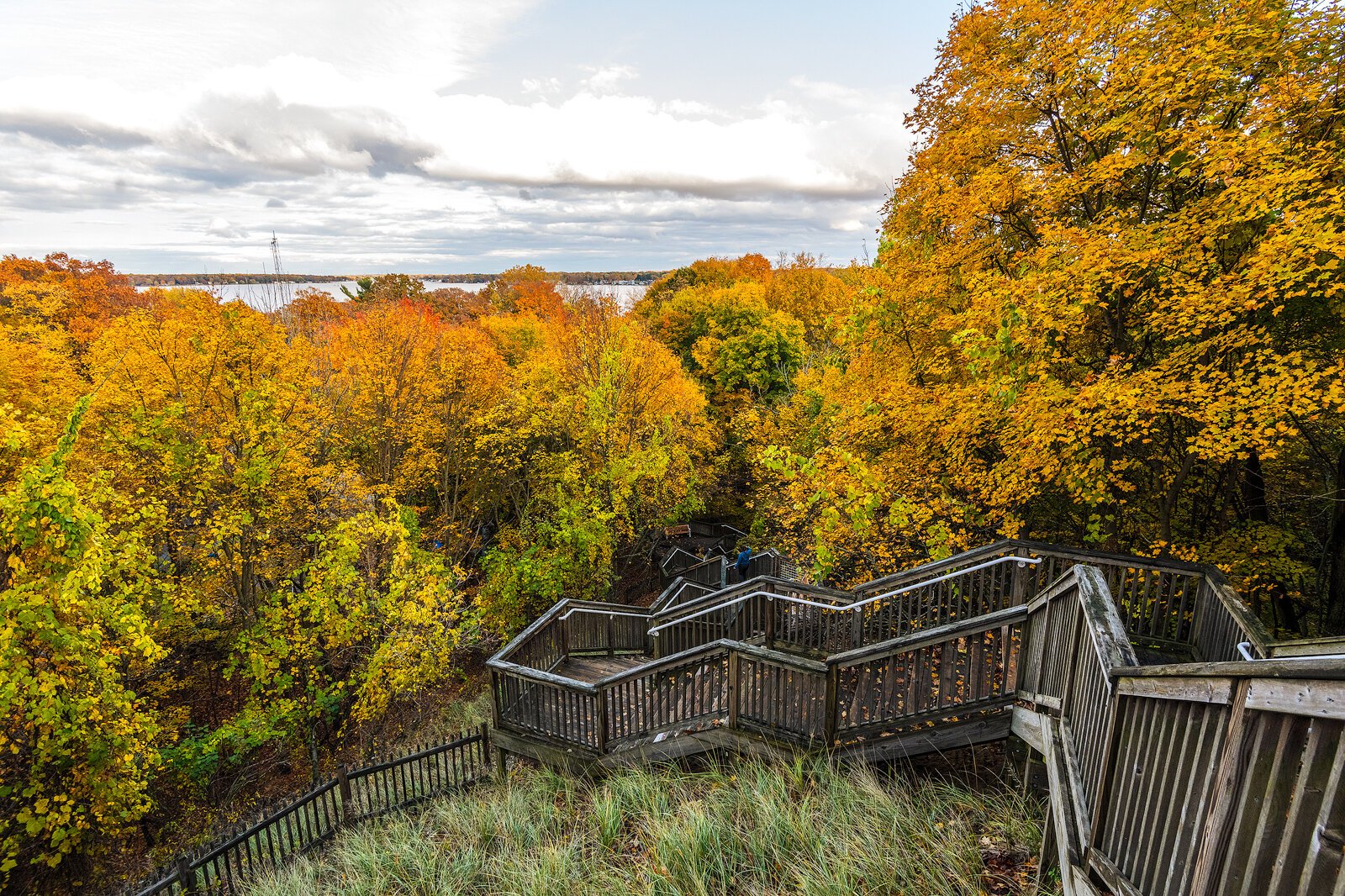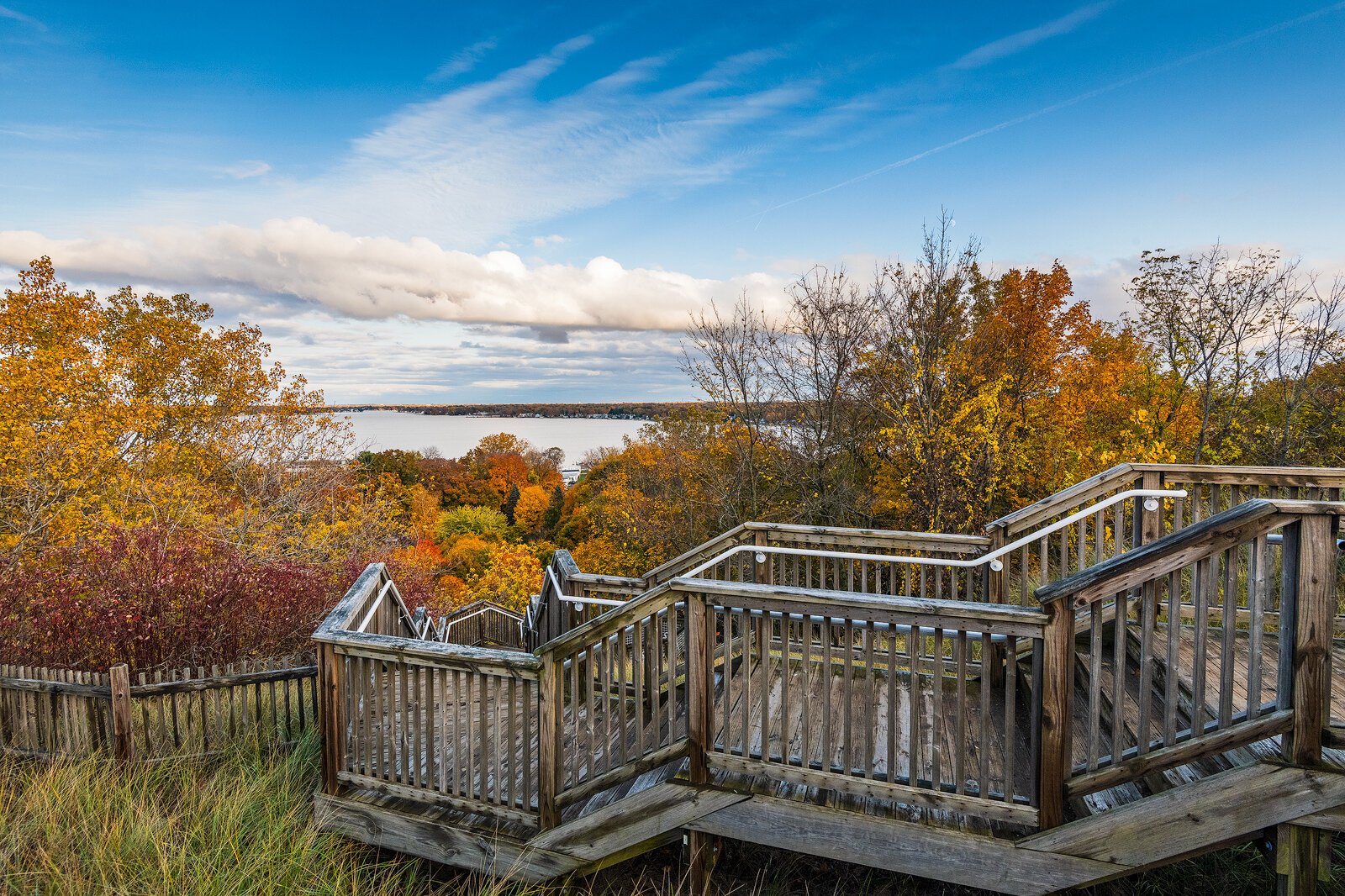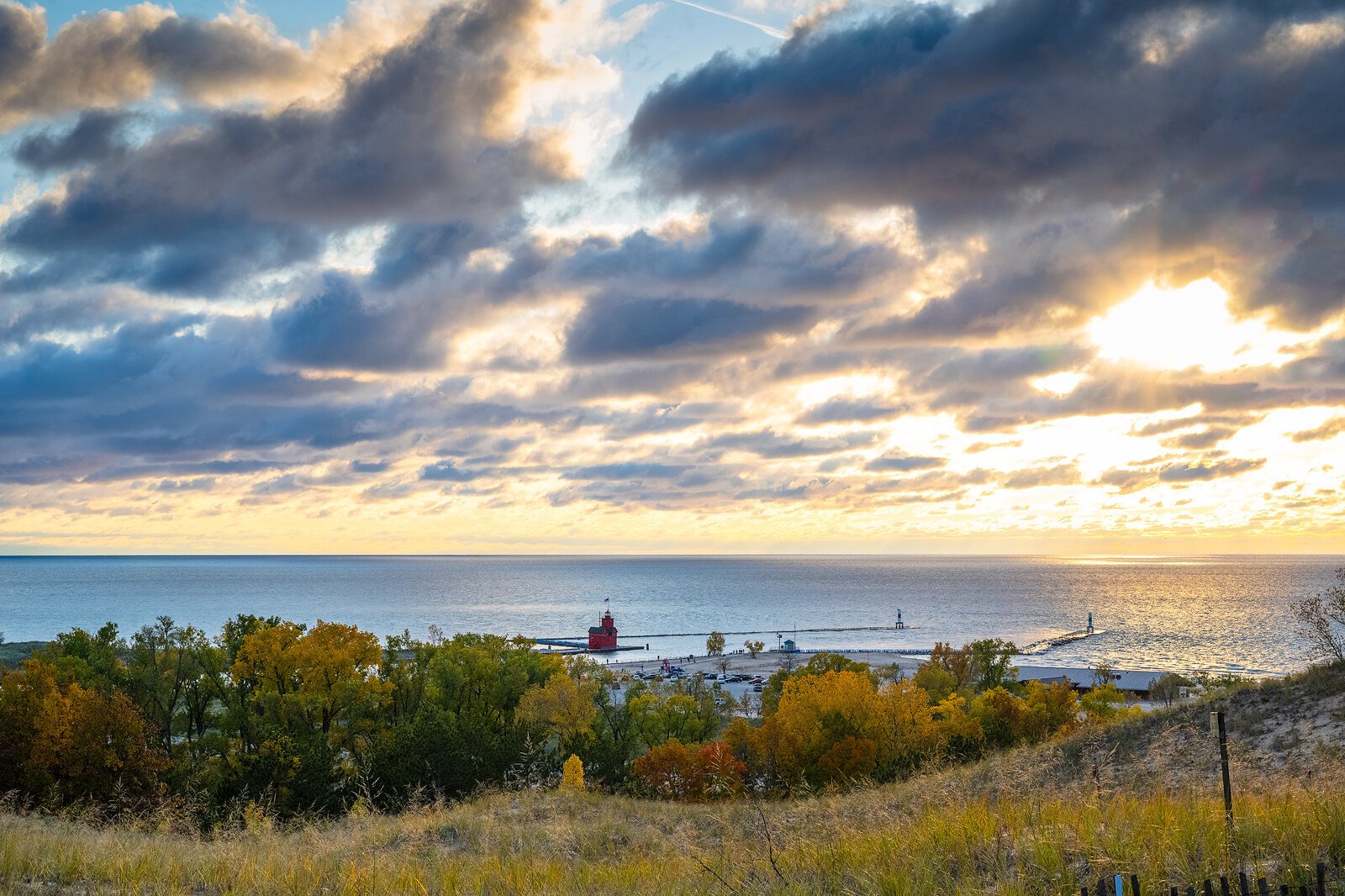 The dune offers commanding views of Lake Michigan, Lake Macatawa, and the Holland Harbor Lighthouse, commonly known as “Big Red.” But Mulligan, current manager and former ranger at the state park, says visitors would frequently scramble up the dune despite the lack of a staircase. That created erosion problems and sometimes resulted in visitors accidentally stumbling into the park’s administration area on the back side of the dune.