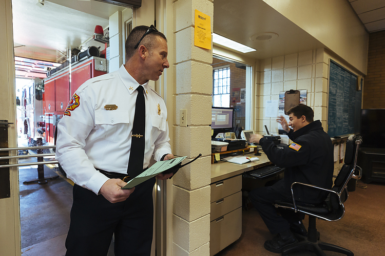 Twenty-year veteran Shane Howell (left) stops by with paperwork as Private Michael Pence (right) works the Station 18 desk where crew members field emergency calls and help citizen who walk in with an emergency. (Ziggy Mack)