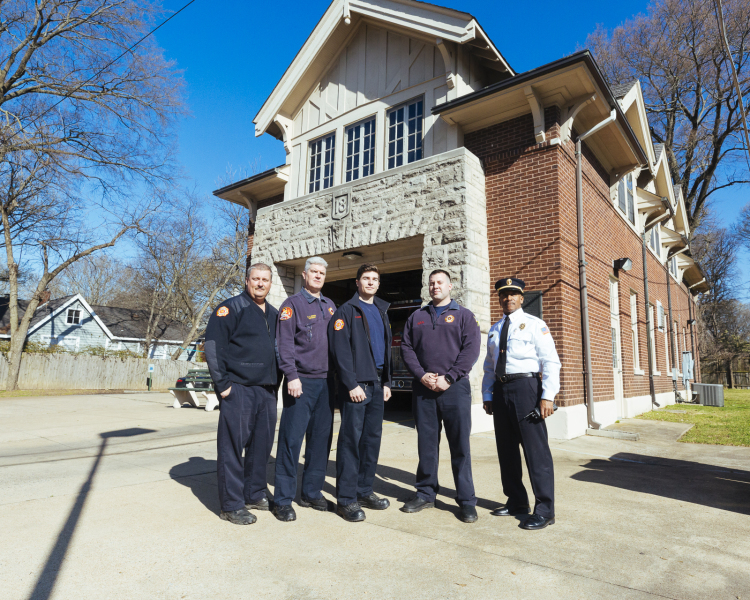 One of three four-person crews who call Fire Station 18 home. Left to right: Driver Daniel Griffith, Lieutenant Mark Johnson, Private Michael Pence, Private Brian Keller and Lieutenant Wayne Cooke, the Memphis Fire Department’s public information officer. (Ziggy Mack)