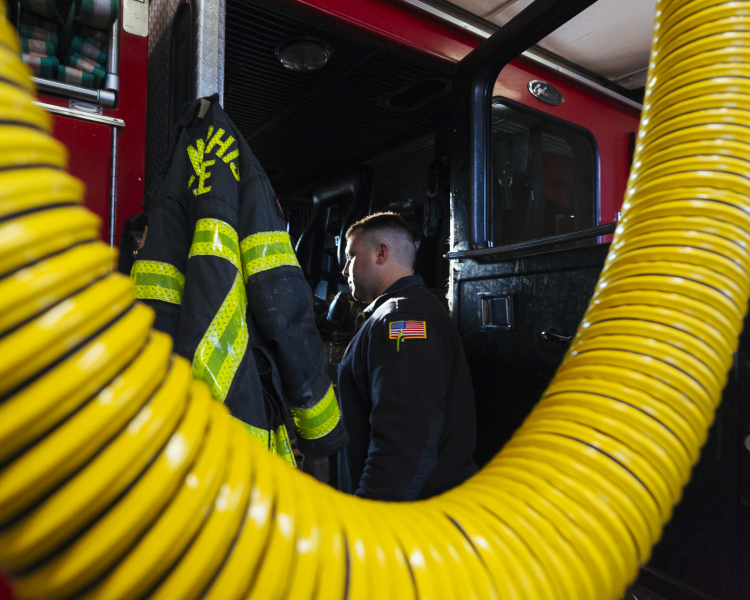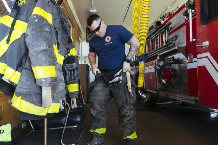 Private Brian Keller inspects his turnout gear as part of his morning routine at Fire Station 18. (Ziggy Mack)