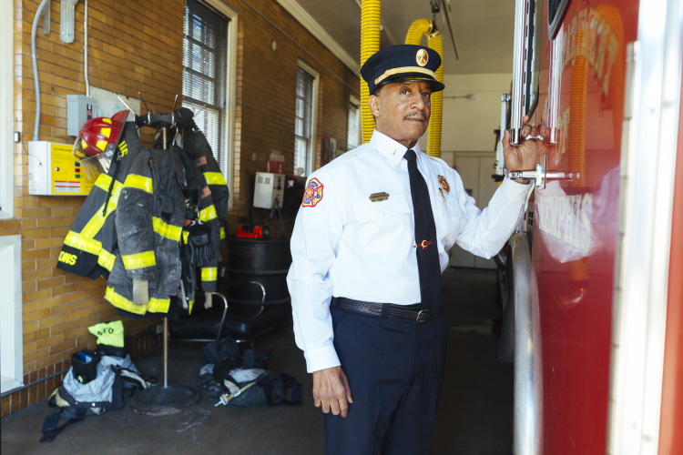 Memphis Fire Department Public Information Officer Lieutenant Wayne Cooke poses next to the pumper at Fire Station 18 in the University District. (Ziggy Mack)