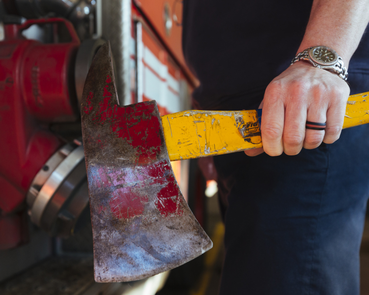 Many of the firefighters wear special wedding rings while on the job. They’re made of silicon and break away if caught to keep from damaging the crew’s fingers in an emergency. The thin red line represents the fellowship and family of firefighters. (Ziggy Mack)