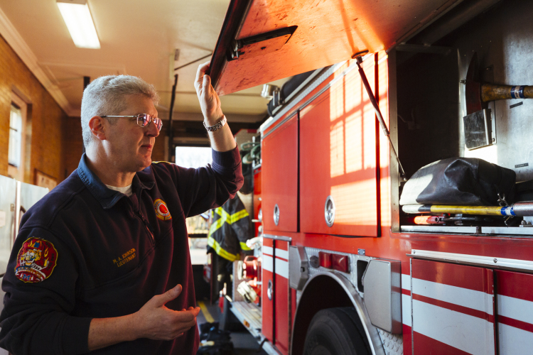 Lieutenant Mark Johnson inspects the pumper truck and its equipment as part of his daily routine to ensure everything is in working order for any emergency. (Ziggy Mack)