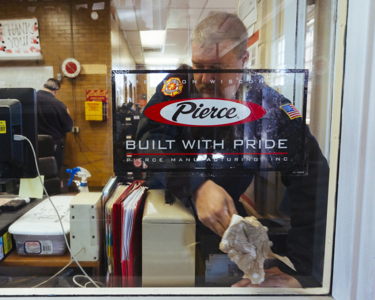 Driver Daniel Griffith cleans the window between the on-watch desk and engine bay. Daily chores are part of life at Station 18. (Ziggy Mack)