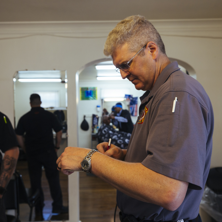 Lieutenant Mark Johnson performs a property assessment at a University District barber shop. In the background, Randy Richmond cuts Marvin Freeman’s hair. Commercial assessments are part of a strategy to educate the public on fire prevention. (Ziggy Mack)