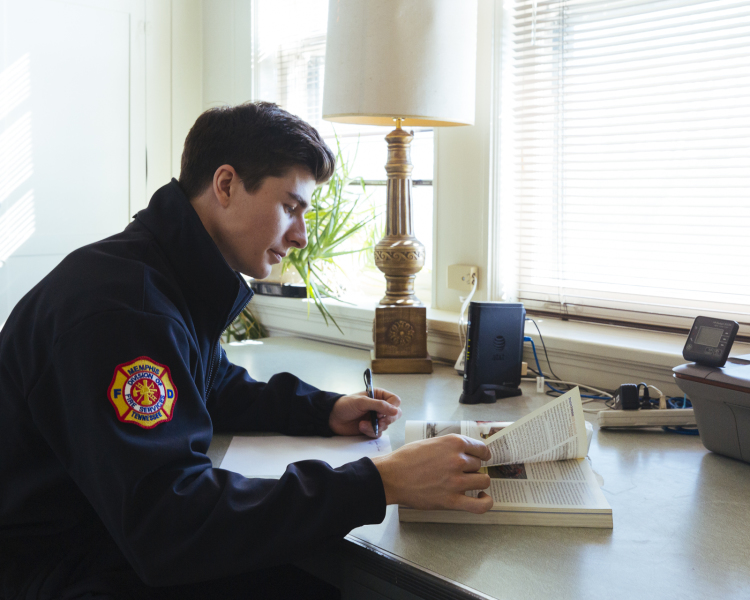 Private Michael Pence studies in the fire station’s designated quiet area. In the first four years, crew members must earn several certifications from medical, fire and hazard materials trainings to continue their careers. (Ziggy Mack)