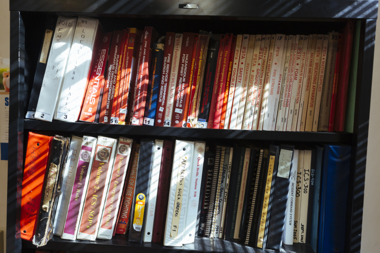Study materials on topics from resuscitation techniques to chemical reactions line the bookcases at Station 18. Daily training is also part of life at the station. (Ziggy Mack)