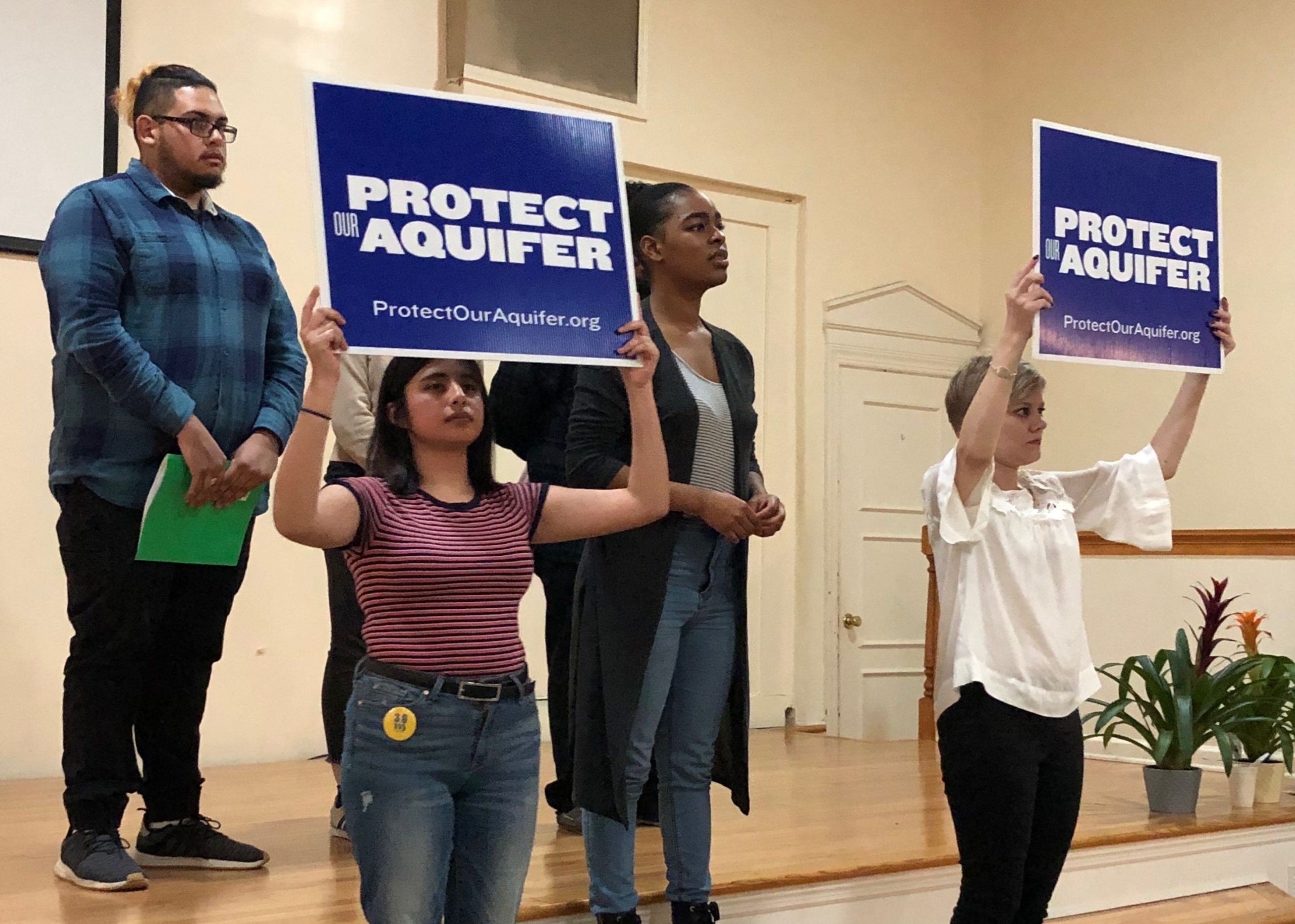 In a scene from the performance, cast members give an artistic re-enactment of neighbors joining together to oppose a proposed neighborhood landfill. From left to right: Michel Angel, Jazmin Bautista, Kierra Turner and Casey Greer. (Scarlet Ponder)
