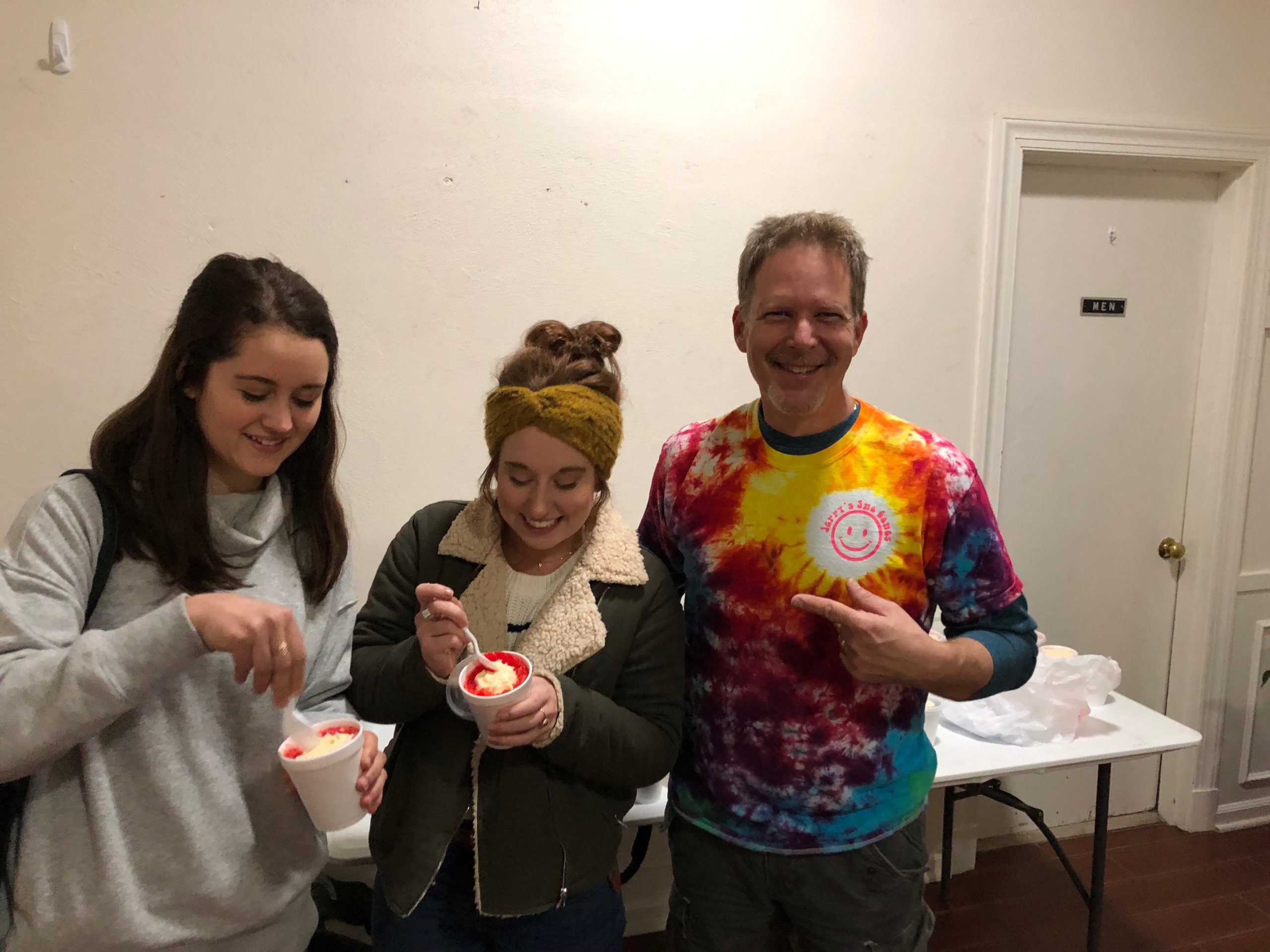 Audience members Emily Hall and Claire Jaggers enjoy a free sno-cone with Jerry’s Sno-Cone owner David Aklin before the show. (Scarlet Ponder)