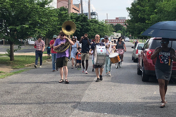 The June 2nd kickoff event was a celebration its organizers hope will continue throughout the installation’s time in Memphis. The festivities began with a New Orleans-style second line parade through the streets of Uptown, led by the Mighty Souls Brass Band. The parade ended at Treedom Memphis, followed by the community picnic. Attendees mingled in the symbolic forest and enjoyed complimentary sack lunches, MEMPopS, games, and music.