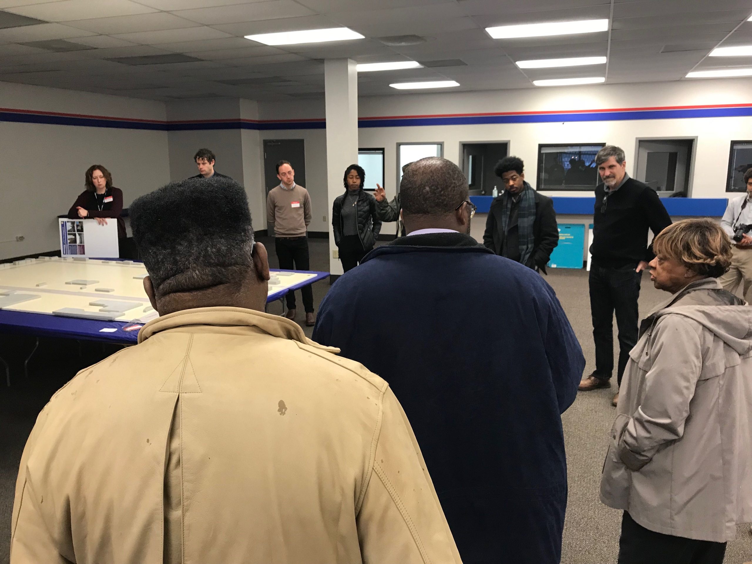 For the design charrette, the planning team built a large map of the Whitehaven Plaza with gray 3-D printed blocks representing existing buildings and asked residents to create their ideal space with paper, markers, sticky notes and red 3-D printed blocks representing new construction.