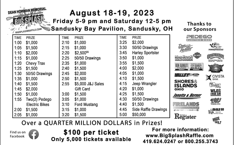 What is it: It’s time to make a splash at this year’s Big Splash Raffle Aug. 18-19 at the Sandusky Bay Pavilion. The raffle raises funds for the operation of the Maritime Museum of Sandusky.