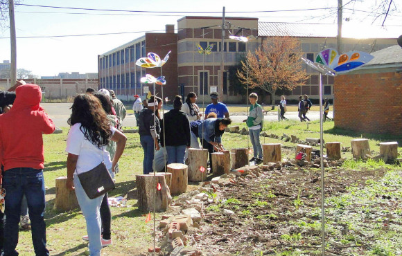 Artists from the Memphis College of Art designed the butterflies, which were fabricated from aluminum and colored plexiglass and then assembled by a group of volunteers from Bridges. During a special neighborhood event, the butterflies were “released” throughout the two neighborhood gardens along the paths to the gardens and in the yards of a few nearby residents.