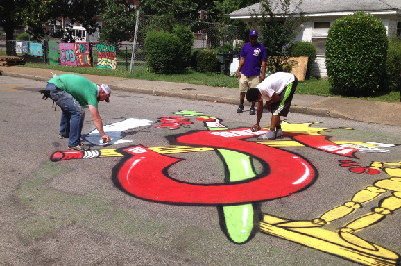On Tuesday, June 20, a special event just for the children artists of the art garden was held with the Mighty Soul Brass Band on hand for entertainment, MEMPops giving out icy cool refreshments and a several artists participating in a collaborative freeform street painting.