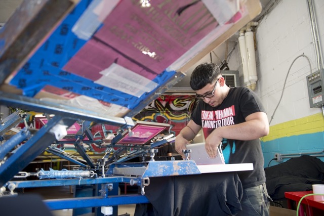 A member of Stitching Up Detroit inks a shirt at the screen printing facility at Grace in Action