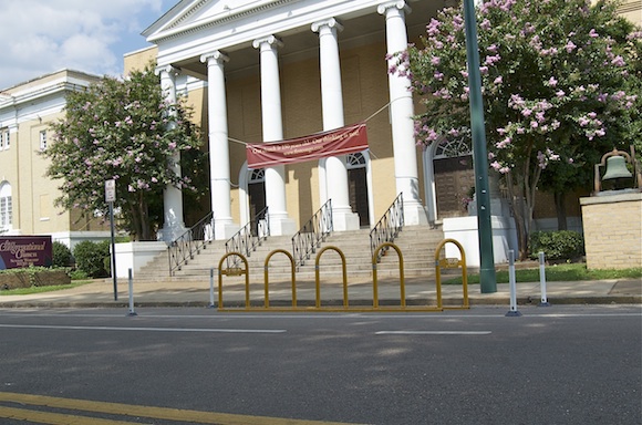 It may not seem like much at first glance–five pieces of metal painted bright yellow, like a new installation of public art–but this is a bike corral, and it is another spoke in the increasing effort to see Memphis as a major cycling city.