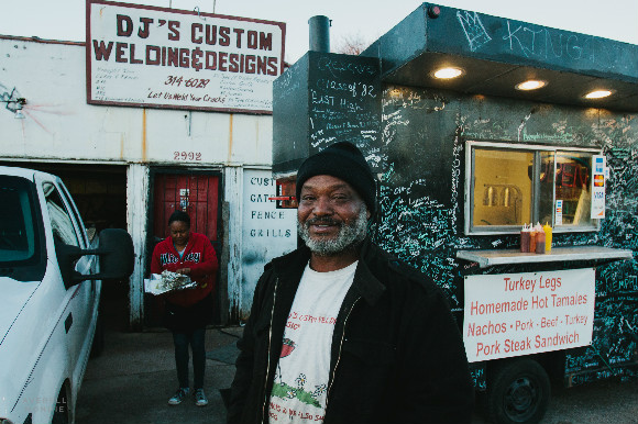While the building advertises a welding business inside, in front is his own custom-made food cart serving a friendly welcome in the flavors of hot tamales, ribs and turkey legs.