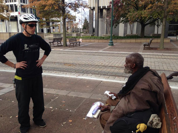 “Instead of having the homeless come to a church or a mission, we felt we could approach people better. We reach out to folks and let them know that someone loves them by going to them instead of having them come to us. So that is where the bicycle part of it comes in,” says Frank Rouse, a volunteer who has been with UBFM since its early days.
