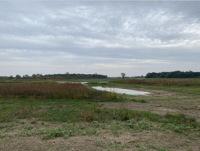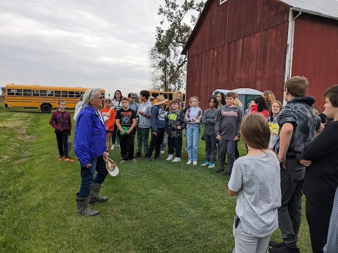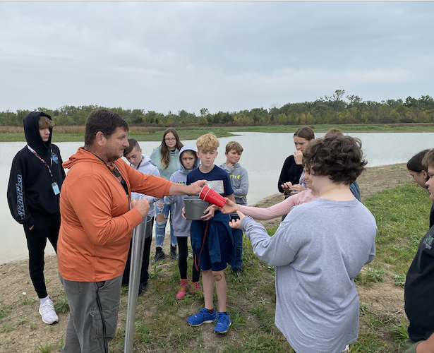 “The lush grassland was burned two weeks after their fall field trip, and the following spring they saw nearly 80 acres of charred earth covered with wild onions, and twigs planted in the riparian buffer,” Harder-Thorne says. “Year 2 students not only saw the finished wetland excavation in October 2023, but the grasses and flowers had already replaced the wild onions.