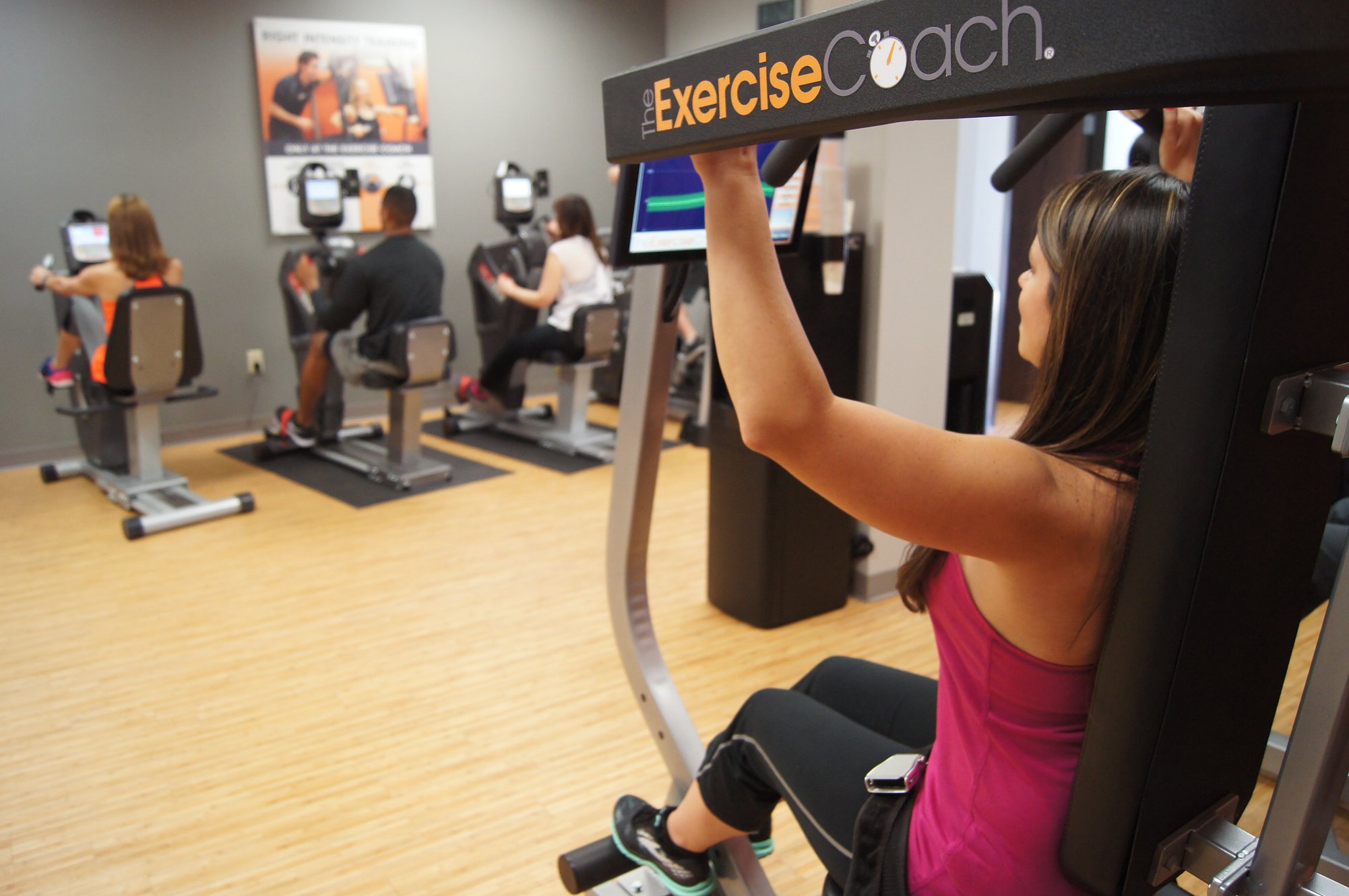 The Exercise Coach program calls for two twenty-minute workouts per week. How do clients get a full workout in that timeframe? Technology is the key. Each fitness machine that a customer uses has a computer that tracks their session. During the first workout, the best three attempts at a particular exercise are recorded and averaged, becoming the benchmark to meet during the next workout.