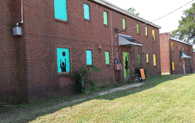 ComCap called on the UrbanArt Commission to identify and select a local artist, Arnold Thompson, to lead the exterior beautification project, which consisted of the installation of 68 art panels to cover the doors and windows on the north side of the apartment complex.