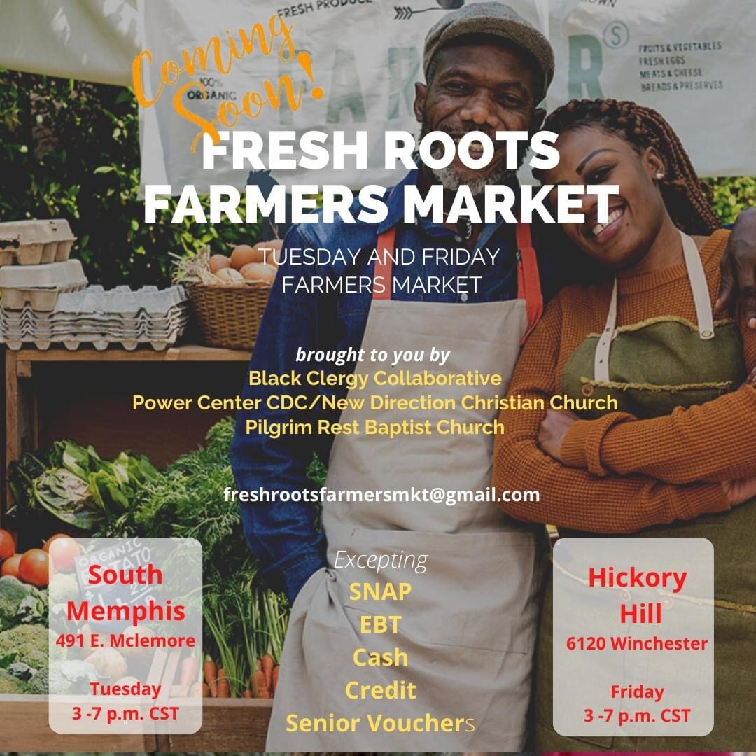 The Fresh Roots Farmers Markets can be found in the parking lots of New Direction Christian Church (Fridays from 3 to 7 p.m.) and Pilgrim Rest Baptist Church (Tuesdays from 3 to 7 p.m.) in Memphis. Operations began in June and will run through September.