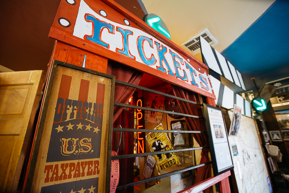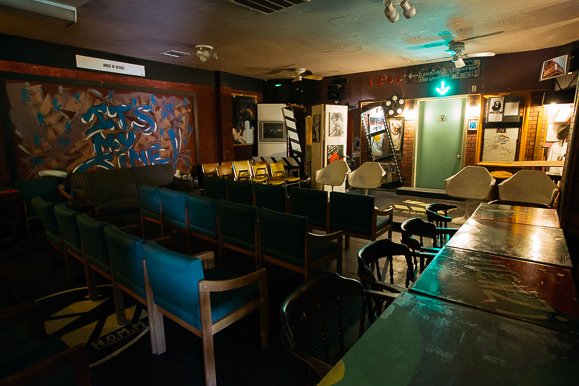 Hand-painted murals in right blues, reds and yellows read ‘It’s My Time’ and encourage customers to ‘Support the Arts’ and ‘book your event here!’