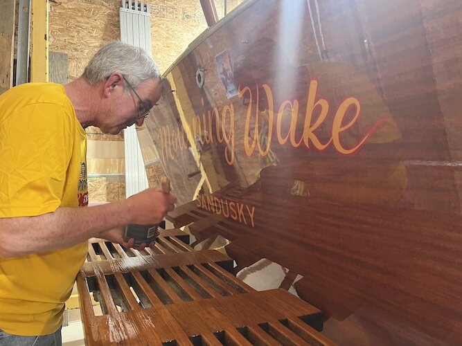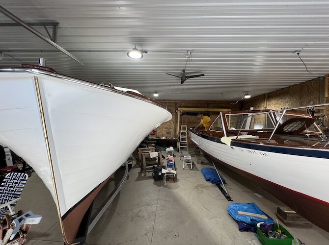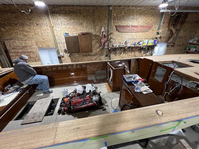 The pair hauled the Mourning Wake to “Bill’s Barn” in October 2022 and began a seven-month project to rewire the engine, dash, and varnish the boat.