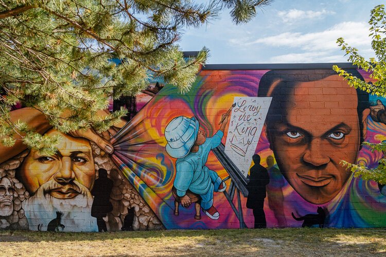 Fel’le’s 100-foot-wide mural is called “LeRoy the King.” It incorporates different elements of Foster’s life, including his own Frederick Douglass mural.