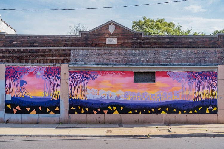 Not Far from “Psychedelic Shack” is another installation called “Birchcrest” by Megan White, who’s also known as Daisy. White, an art therapist and artist, grew up just a few blocks away from her mural, which shows a colorful horizon filled with trees and homes and features a young woman gazing reflectively over the scene.