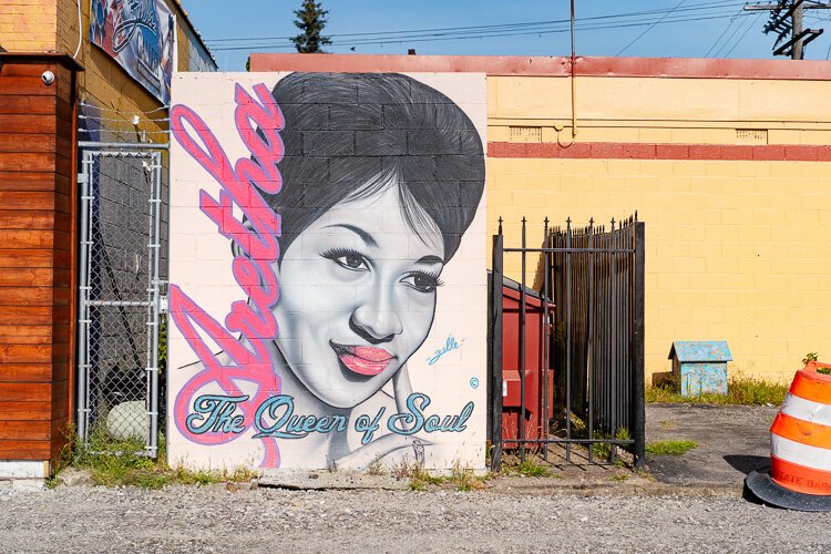 “The Aretha Franklin mural is based on her energy and the love and support she always showed Detroit,” says Fel’le. “Her being connected with music and the arts and me being an artist, I felt I had some type of connection, so I just wanted to show my love.”