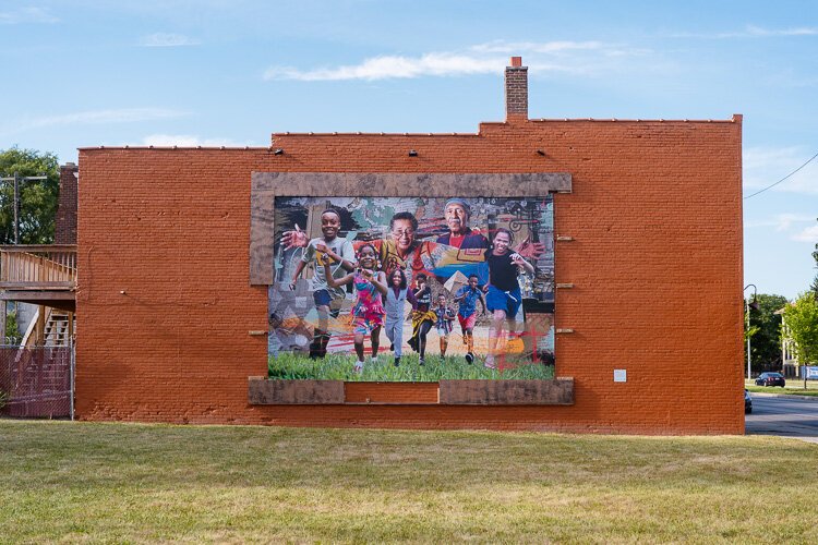 “What We Need Is Education,” which depicts a variety of people teaching, learning, and creating, is being installed on Puritan Avenue between Wisconsin and Ohio Streets.