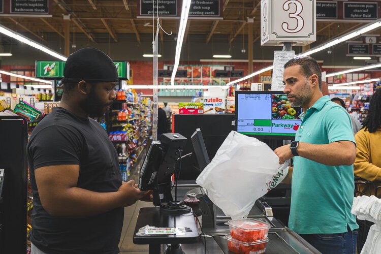 Nia Morris rings up customers at Parkway Foods.