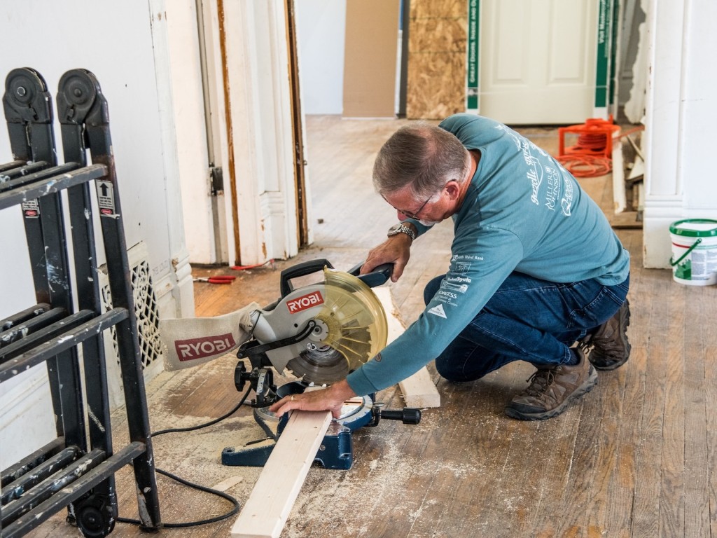 Workers were sawing in the downstairs living area, making structural changes. Some professional contractors volunteer their time, and Platte says they pay professionals to do electrical, plumbing, and HVAC.