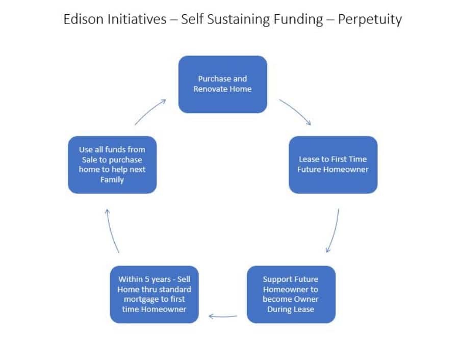 In five years, the family will need to be ready to get a mortgage and buy the house from Edison Initiatives. All the money from the sale will go back into Edison Initiatives to buy and rehab more houses.