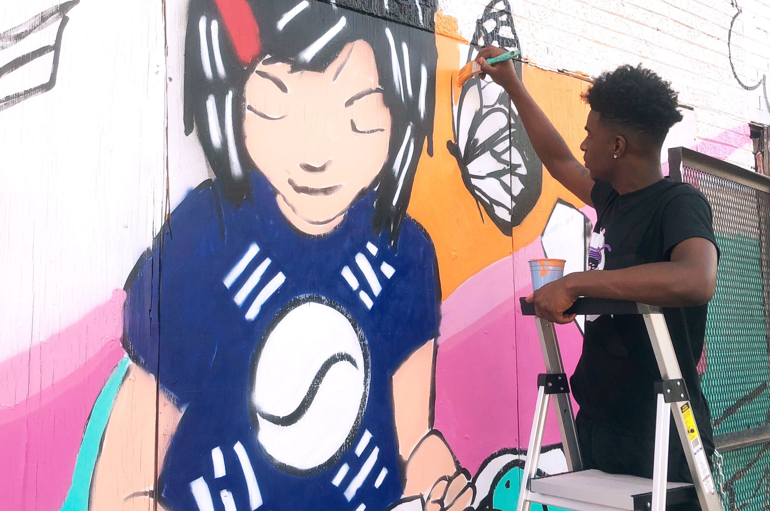 Donte Davis is one of the young artists hard at work on the mural, but he doesn’t consider the project to be work.