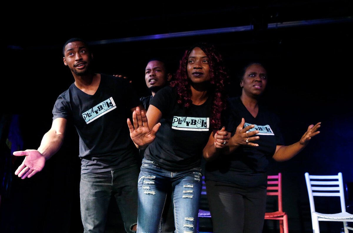 Playback theater is a form of spontaneous, improv theater where audience members tell stories from their lives and professional actors “play them back” through movement, words, song, and music.