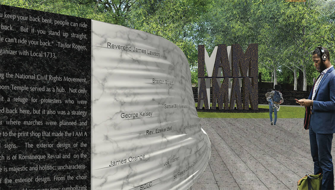 The plaza design will feature 15-foot stainless steel letters that spell out I AM A MAN with quotes from various civil rights leaders printed on the letters. The project, which includes $700,000 for the public art piece and $1 million for construction, is expected to be completed in time for the 50th anniversary of the strike and death of Dr. Martin Luther King Jr., both of which took place April 1968.