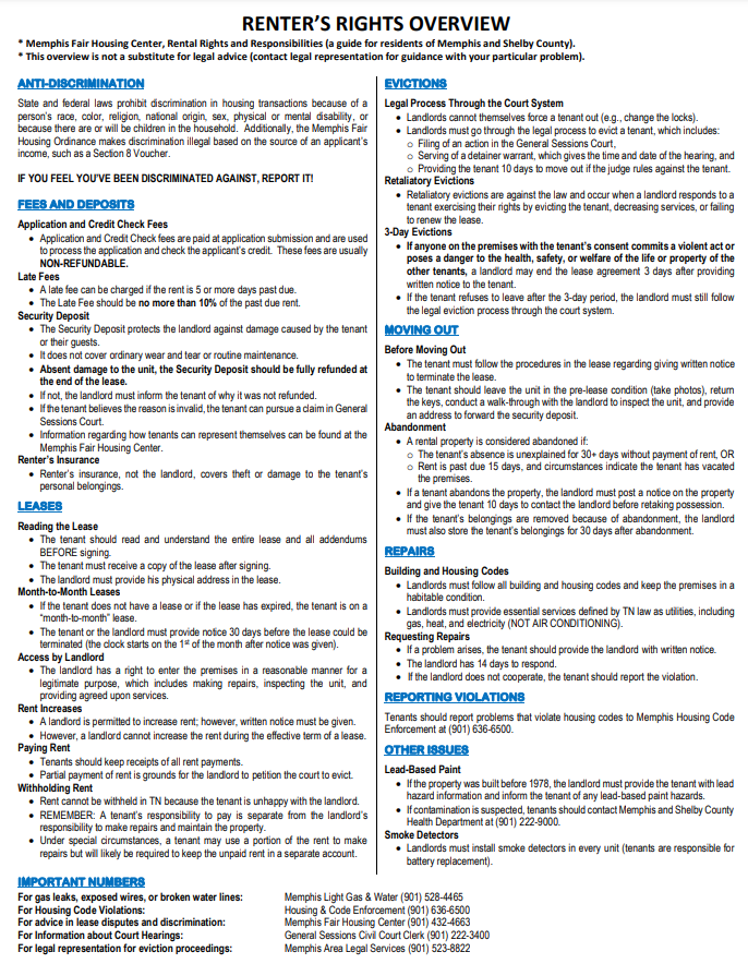Sawyer said further assistance and a more comprehensive renter’s guide are available from the Memphis Fair Housing Center, a service of Memphis Area Legal Services. Renters who need more support can call MFHC at (901) 432-4663 or visit the office at 22 N. Front St.,11th Floor.