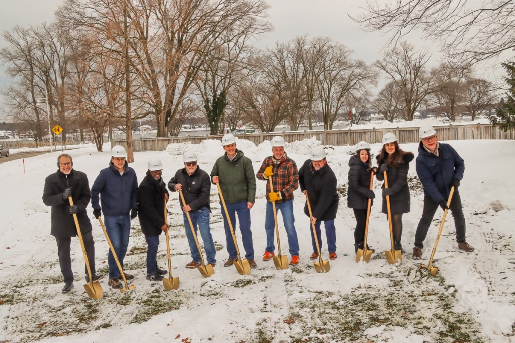 On this chilly morning in Holland, giant snowflakes blew in from Lake Macatawa, causing folks looking to attend the noon groundbreaking to seek warmth before the ceremony.