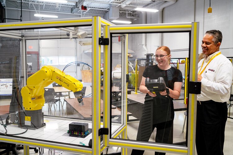 Students in the FANUC program learn basic techniques for operating, constructing, and programming robots. After they have learned these basic skills, Sparrow says, they can parlay their skill sets into more advanced training – and, eventually, careers – that FANUC offers.